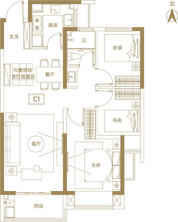 主臥與客廳均朝南,滿足全家人的采光需要;同時專門設置了兒童娛樂烹飪照看區,時刻關切孩子成長的每一瞬間。
