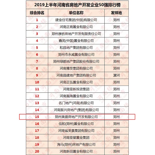 正是這樣的務實精神,實干精神,在2019年8月26日,河南樓市網數據研究中心發布了2019上半年河南省房地產開發企業50強排行榜,美盛逆勢突圍,首次入圍即強勢進入TOP15。