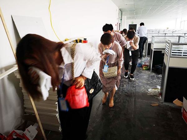警報響起,疏散引導人員組引導員工與業戶開始向疏散走道、安全出口緊張有序的進行疏散。