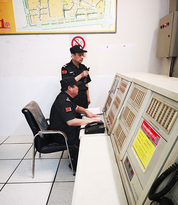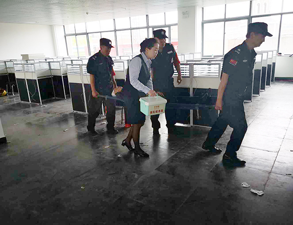 演習中,工作人員發現“火情”,監控室接到火情警報,呼叫巡邏崗確認火情之后立即啟動消防應急預案,消防員迅速跑步到現場,進行滅火。