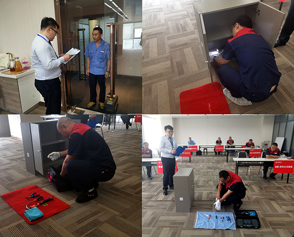 入戶維修場(chǎng)景模擬演練,考核選手從敲門禮貌、詢問(wèn)業(yè)主、征得同意后穿鞋套到入戶維修等一系列維修流程。